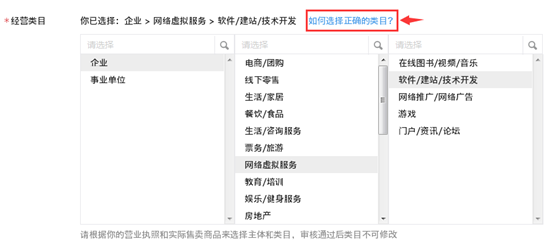 b.*經(jīng)營類目:根據(jù)實際情況進行選擇,如不明白可點擊查看“如何選擇正確的類目”,如圖所示紅框處。某些經(jīng)營類目后續(xù)需要繳納手續(xù)費,請仔細(xì)查看并選擇。