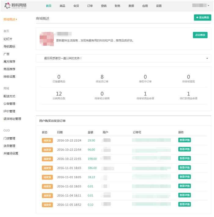 1.進(jìn)入商城后臺管理首先能看到商城概述,商城概述有展示出部分信息,點(diǎn)擊可查看具體詳情,參見下圖: