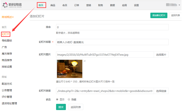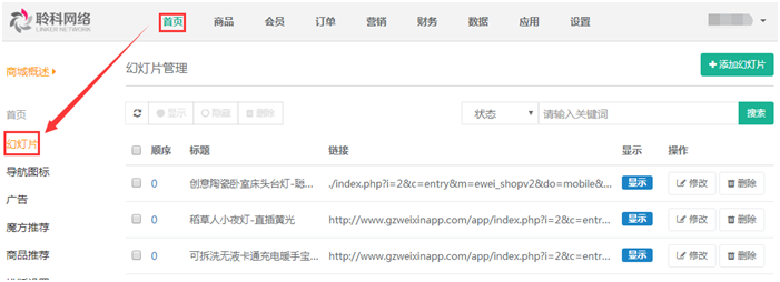 2.幻燈片:對商城首頁的幻燈片進(jìn)行添加和管理,點(diǎn)擊右上角的“添加新幻燈片”進(jìn)行添加,參見下圖:
