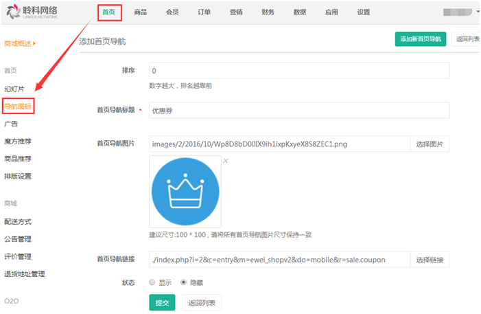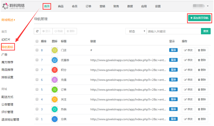 添加成功后,在導(dǎo)航圖標(biāo)列表頁面可查看,也可對其進(jìn)行修改刪除以及狀態(tài)的改變,參見下圖: