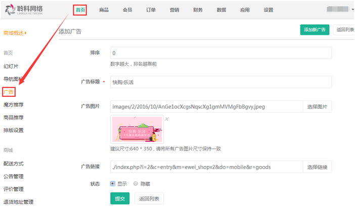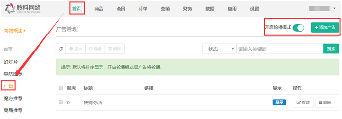 4.廣告:對商城首頁廣告圖的添加和管理,參見下圖: