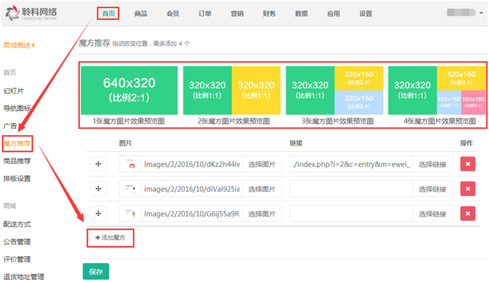 5.魔方推薦:魔方欄可以展示出多個(gè)廣告位,最多添加四個(gè),根據(jù)添加的數(shù)量會(huì)呈現(xiàn)出不同的展示方式,參見下圖: