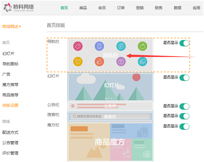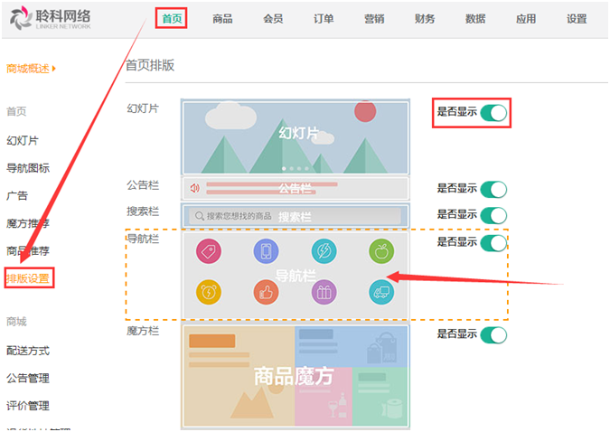 7.排版設(shè)置:對首頁的格局排版進(jìn)行管理設(shè)置,可選擇顯示的版塊,可拖動(dòng)版塊顯示的位置,參見下圖: