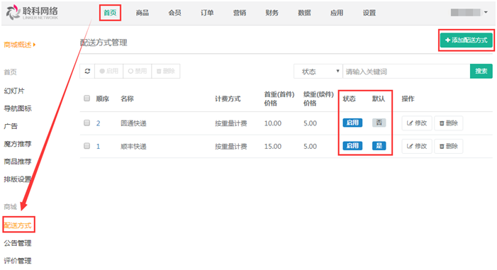 說明:配送方式添加完畢且狀態(tài)為“啟用”后即可在添加商品或已添加的商品選擇“運(yùn)費(fèi)模板”處選擇,買家購買商品時(shí)運(yùn)費(fèi)則會(huì)按照添加配送方式時(shí)選擇的計(jì)算方式來計(jì)算