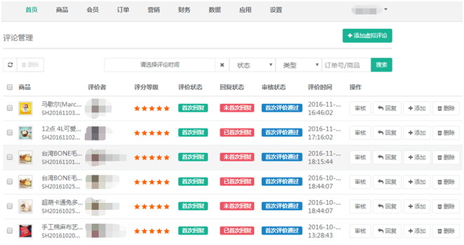 10.評價(jià)管理:可對商城內(nèi)所有商品的評價(jià)進(jìn)行管理,包括審核、回復(fù)、添加、刪除,也可以添加虛擬評論,參見下圖: