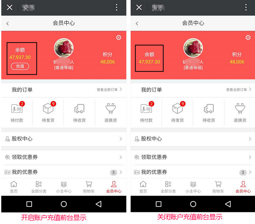4、開啟賬戶充值,會員在手機端就可以進行在商城賬戶余額中進行充值金額,反之則不能充值,參見下圖: