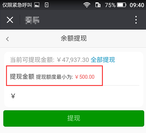 例如:余額提現(xiàn)限制設置滿500元才能申請?zhí)岈F(xiàn),則只有余額超過500元的才能申請,小于500元的不能申請,參見下圖:
