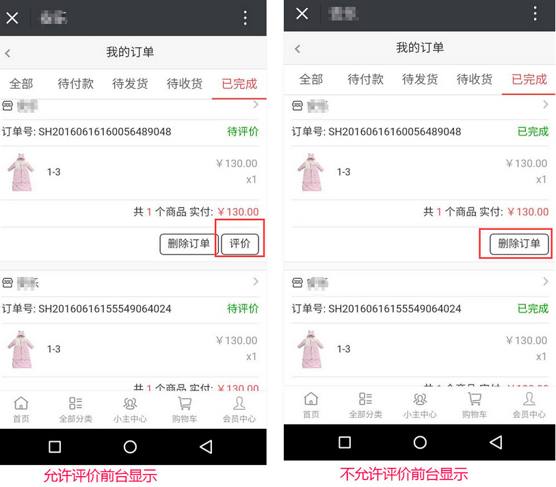 例如:設置訂單完成7天后可發(fā)起退款或換貨申請,則買家或系統(tǒng)確認收貨7天內(包含當天),可發(fā)起售后申請,超過則不允許售后申請,只有待評價與刪除訂單,參見下圖: