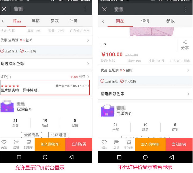 8、選擇是否允許買家評論商品,允許則買家可評價,反之則不能評價,是否顯示買家評論的信息與是否允許買家評價商品相同,參見下圖: