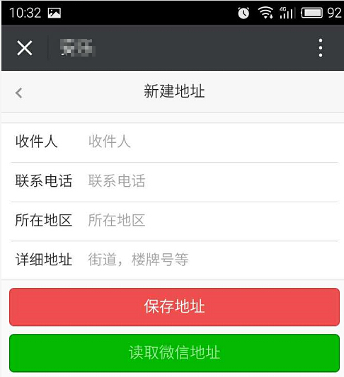 9、開啟獲取微信共享收貨地址后,買家購買商品添加收貨地址時,可直接點擊“讀取微信地址”,反之則不能讀取,參見下圖: