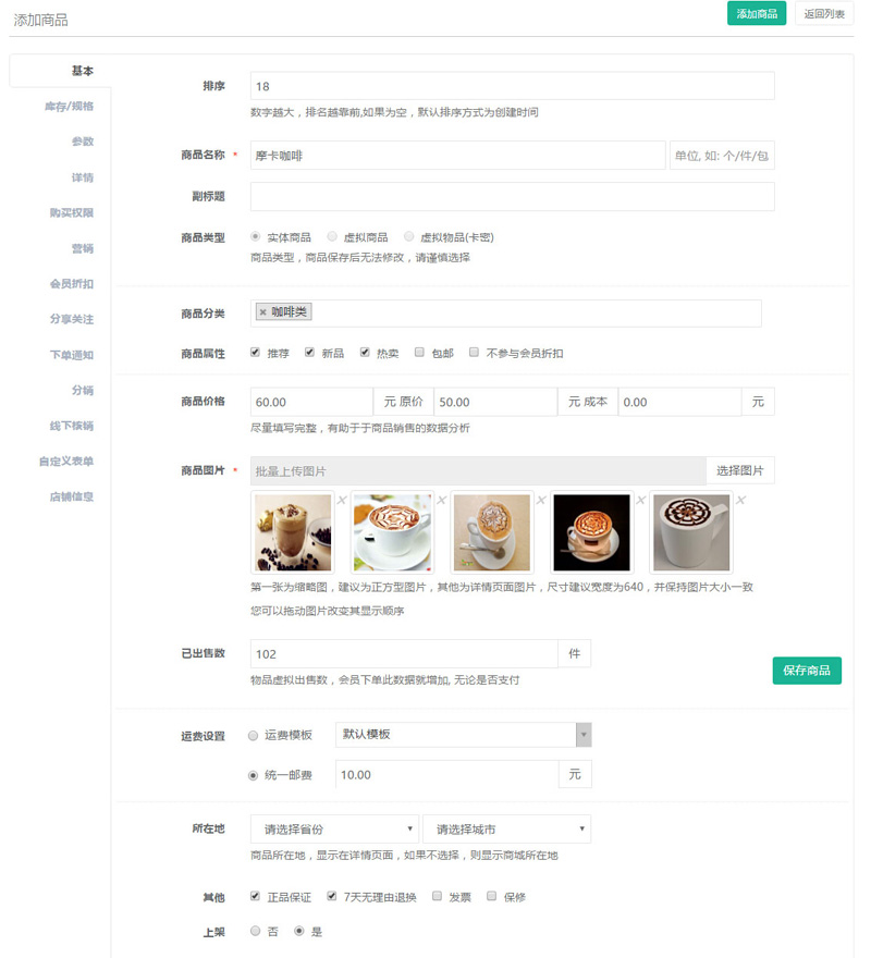 “商品分類(lèi)”選擇已添加設(shè)置的分類(lèi)信息即可,點(diǎn)擊查看商品分類(lèi)操作鏈接。
