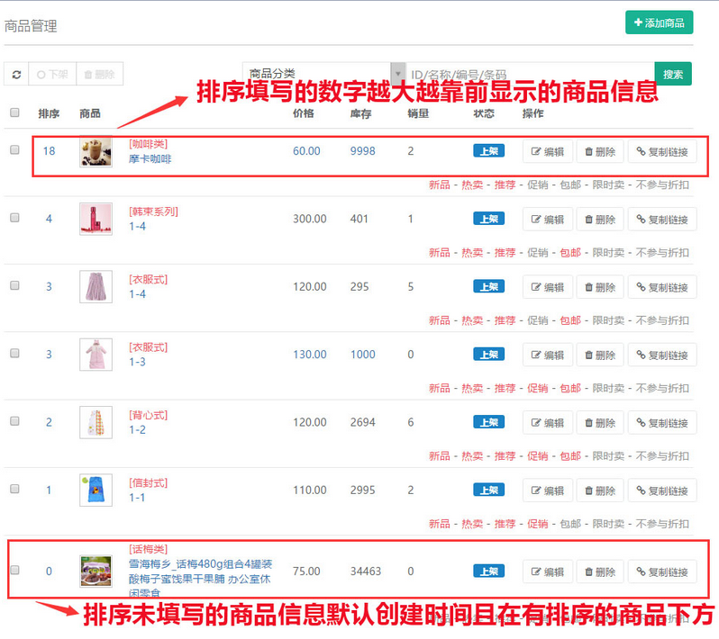 商品的排序是按照“基本”中填寫(xiě)的數(shù)字信息進(jìn)行排序的,數(shù)字越大信息越靠前顯示,如不填寫(xiě)則默認(rèn)為創(chuàng)建添加的商品日期,添加的商品越晚則信息會(huì)越靠前顯示,添加的商品會(huì)在已填寫(xiě)數(shù)字排序的最下方顯示,參見(jiàn)下圖: