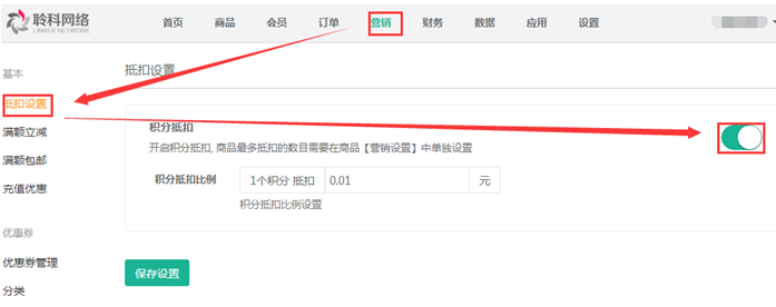 1.抵扣設(shè)置:買家購買商品時,想用所獲取的積分進行相抵扣,而在計算時沒有積分抵扣的入口按鈕,而商家在添加商品在營銷中已設(shè)置了積分抵扣,則是因為沒有開啟商城的積分抵扣的功能按鈕,點擊【營銷】——【抵扣設(shè)置】開啟抵扣按鈕功能,參見下圖: