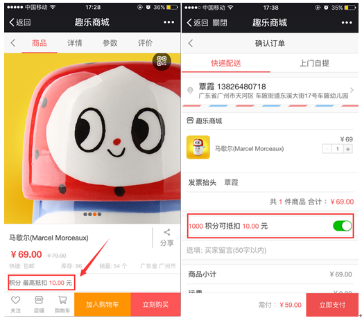如果商品最多抵扣數(shù)目超過10元,則買家購買商品結(jié)算時,會員有多少積分就會抵扣多少積分,參考下圖: