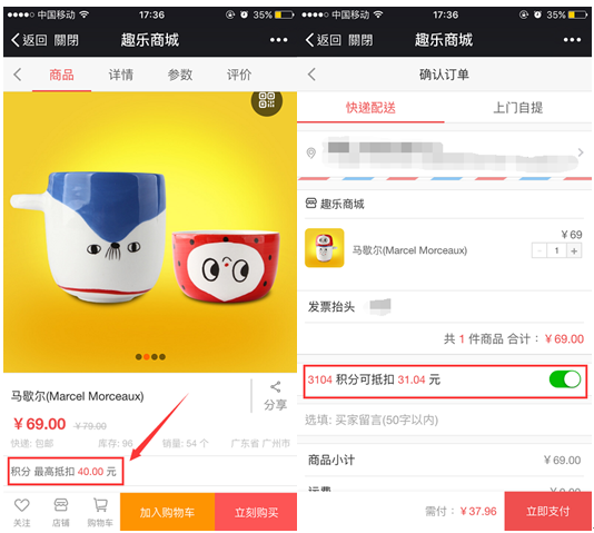 開啟積分抵扣后,則需要設(shè)置積分抵扣比例金額,商品最多抵扣的數(shù)目需要在添加或編輯商品的【營銷】中進行單獨的設(shè)置,如果不設(shè)置的話也是無法進行積分抵扣的,比如:積分抵扣比例設(shè)置為1個積分抵扣0.01元,買家積分為3104,商品的【營銷設(shè)置】中商品最多抵扣數(shù)目為10元,則買家購買商品結(jié)算時積分抵扣顯示1000積分可抵扣10元,參見下圖: