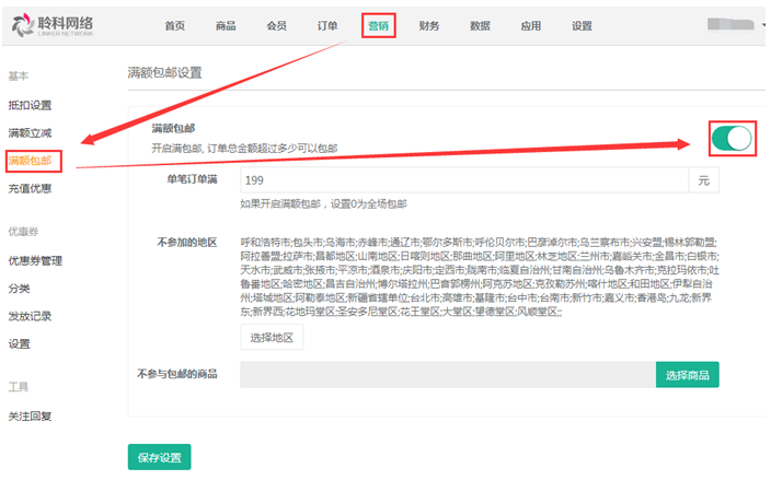 3.滿額包郵:開啟后設(shè)置單筆訂單滿額,商家購買商品達到設(shè)置的單筆滿額數(shù)目,即可享受包郵活動,即使商品基本信息中設(shè)置了運費條件,只要達到商城營銷中的單筆滿額數(shù)目,就可享受包郵,如果商品營銷中設(shè)置了包郵條件,則買家購買有商品營銷包郵條件的商品,達到哪個營銷活動就會享受哪個包郵優(yōu)惠,可以選擇設(shè)置不參與滿額包郵的地區(qū),參考下圖: