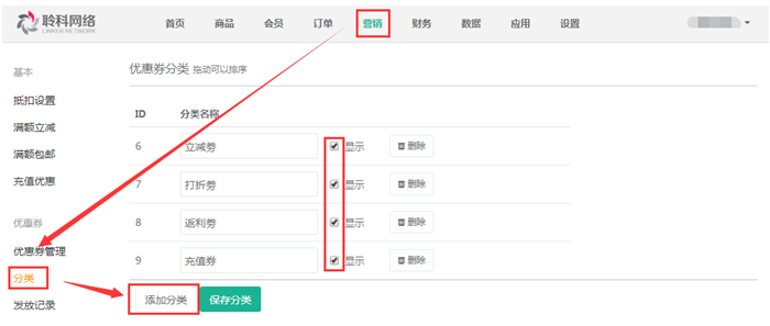 5.優(yōu)惠券管理:添加優(yōu)惠券前,首先要先添加好優(yōu)惠券的分類信息,點擊【營銷】——【分類】——【添加分類】,填寫購物優(yōu)惠券的分類名稱,參見下圖: