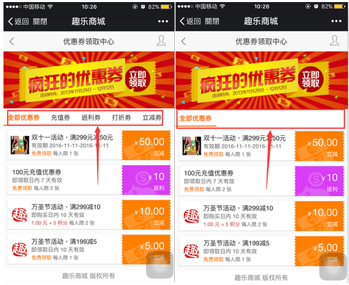優(yōu)惠券分類填添加后勾選顯示,在商城優(yōu)惠券中心就可以看到優(yōu)惠券的分類,點擊分類可以查看對應(yīng)的優(yōu)惠券,參加下圖(圖一),如果沒有勾選顯示,則只顯示“全部優(yōu)惠券”,參見下圖(圖二):