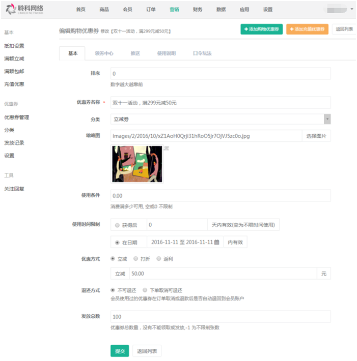 縮略圖:上傳優(yōu)惠券的圖片,方便用戶領(lǐng)取直接使用。