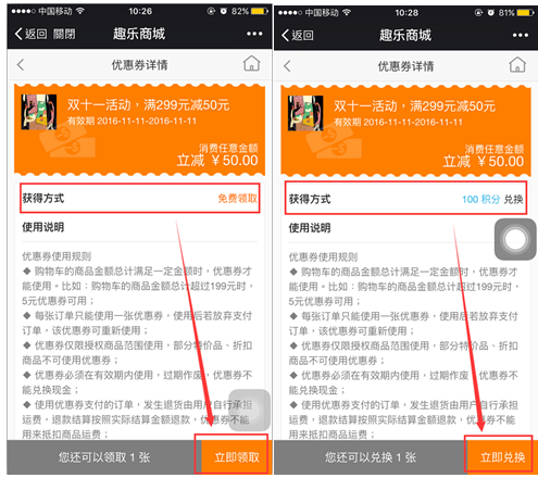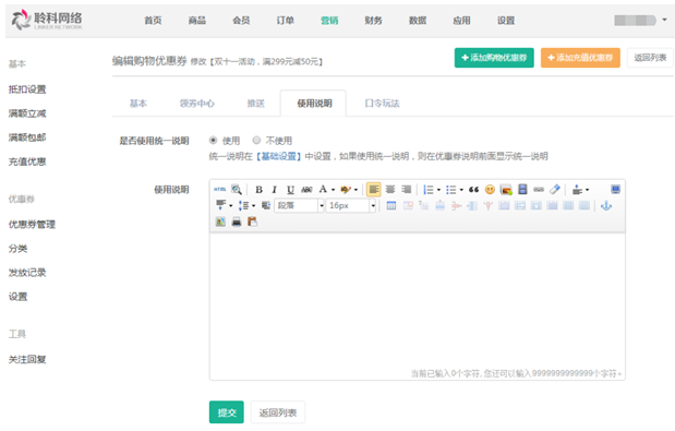 使用說明:設(shè)置優(yōu)惠券詳情頁顯示的具體使用說明,可選擇使用統(tǒng)一的使用說明,也可為某張優(yōu)惠券單獨設(shè)置使用說明: