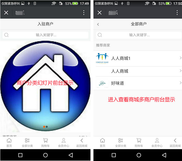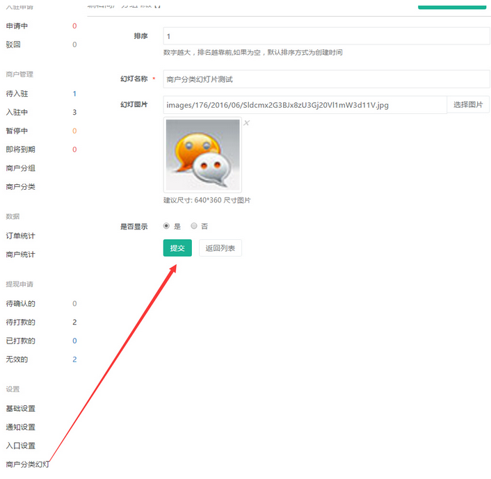 “商戶導(dǎo)航”的入口設(shè)置是商城的會員點擊進入查看商城的多商戶,會員可任意點擊多商戶進入店鋪,“商戶導(dǎo)航”入口設(shè)置與“申請入駐”入口設(shè)置操作相一致,商城可添加“商戶分類幻燈片”,會以滾動圖片的形式顯示在前臺,參見下圖: