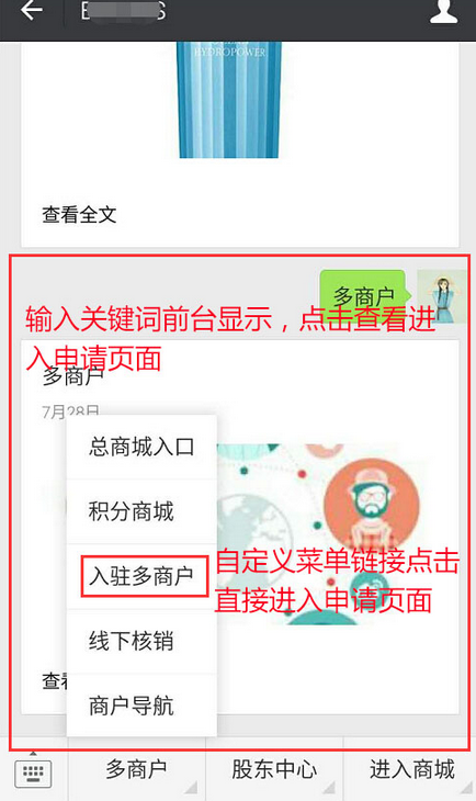 入口的設(shè)置有兩種方式,一種是將鏈接復(fù)制到自定義菜單,會員在菜單直接點擊即可進入申請入駐頁面,進行填寫資料提交申請,另一種是根據(jù)上商城設(shè)置的“關(guān)鍵詞”進入申請入駐頁面,且狀態(tài)必須都是“啟用”,參見下圖: