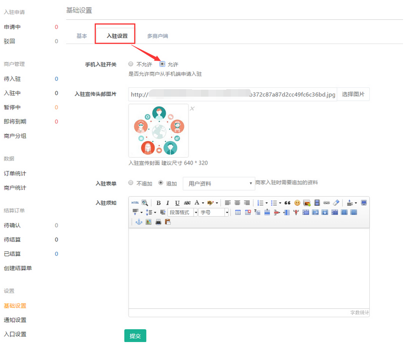 會(huì)員關(guān)注后申請(qǐng)入駐需要在【基礎(chǔ)設(shè)置】——【入駐設(shè)置】中允許手機(jī)端申請(qǐng)入駐,參見下圖: