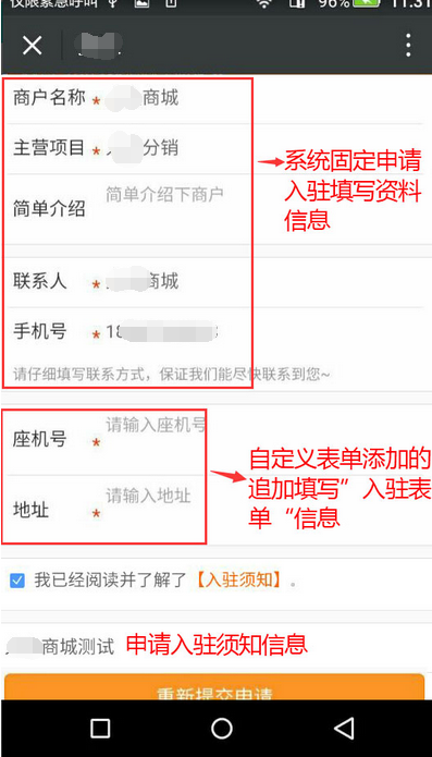 申請(qǐng)入駐時(shí)填寫的資料是系統(tǒng)固定的不定自定義,可在【自定義表單】添加追加”入駐表單“填寫的資料信息,在”入駐表單“選擇追加選擇添加需填寫的自定義資料,參見下圖: