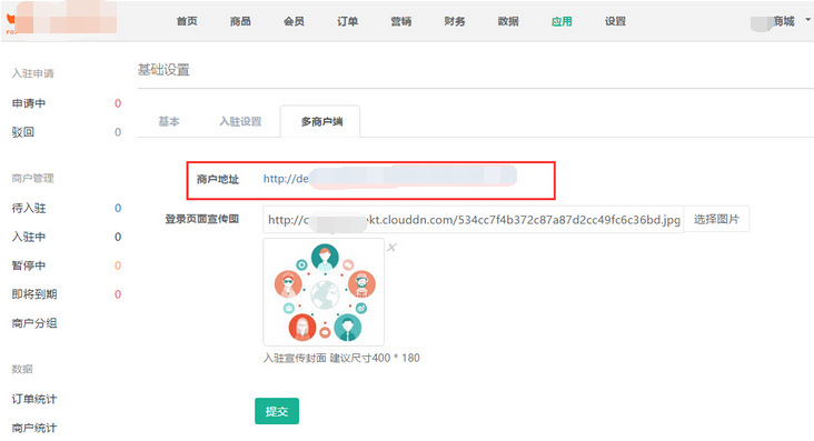 商城處理申請(qǐng)入駐的商家審核通過后,線下將多商戶端登錄后臺(tái)的鏈接及商家主賬號(hào)通知商家,點(diǎn)擊【多商戶端】將鏈接復(fù)制通知商家即可,參見下圖: