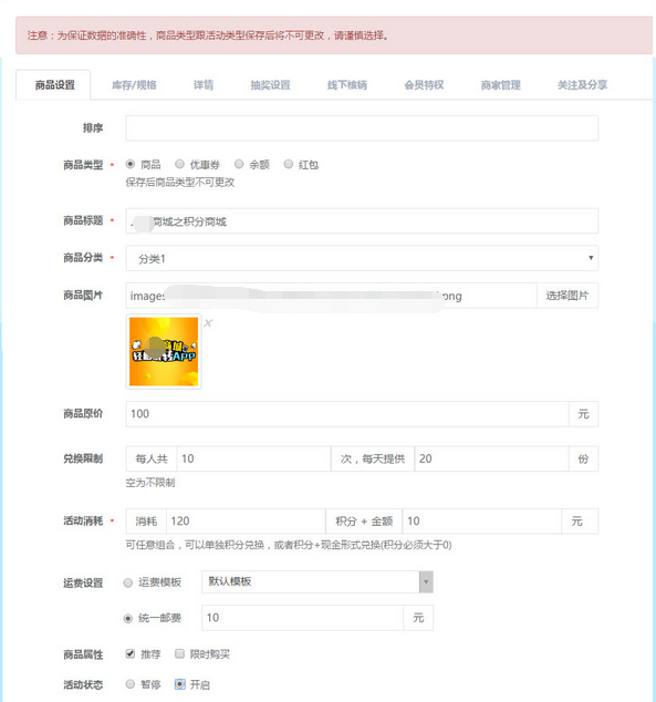 商品類型:點擊選擇(商品)保存后,此類型將無法修改
