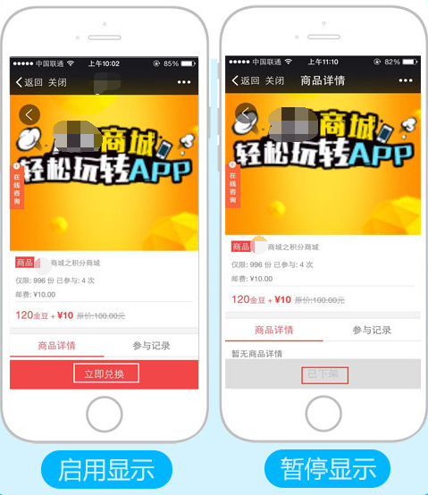 活動狀態(tài):勾選“開啟”才能對商品兌換,反之則不能兌換,顯示商品下架,且不在首頁顯示,參見下圖: